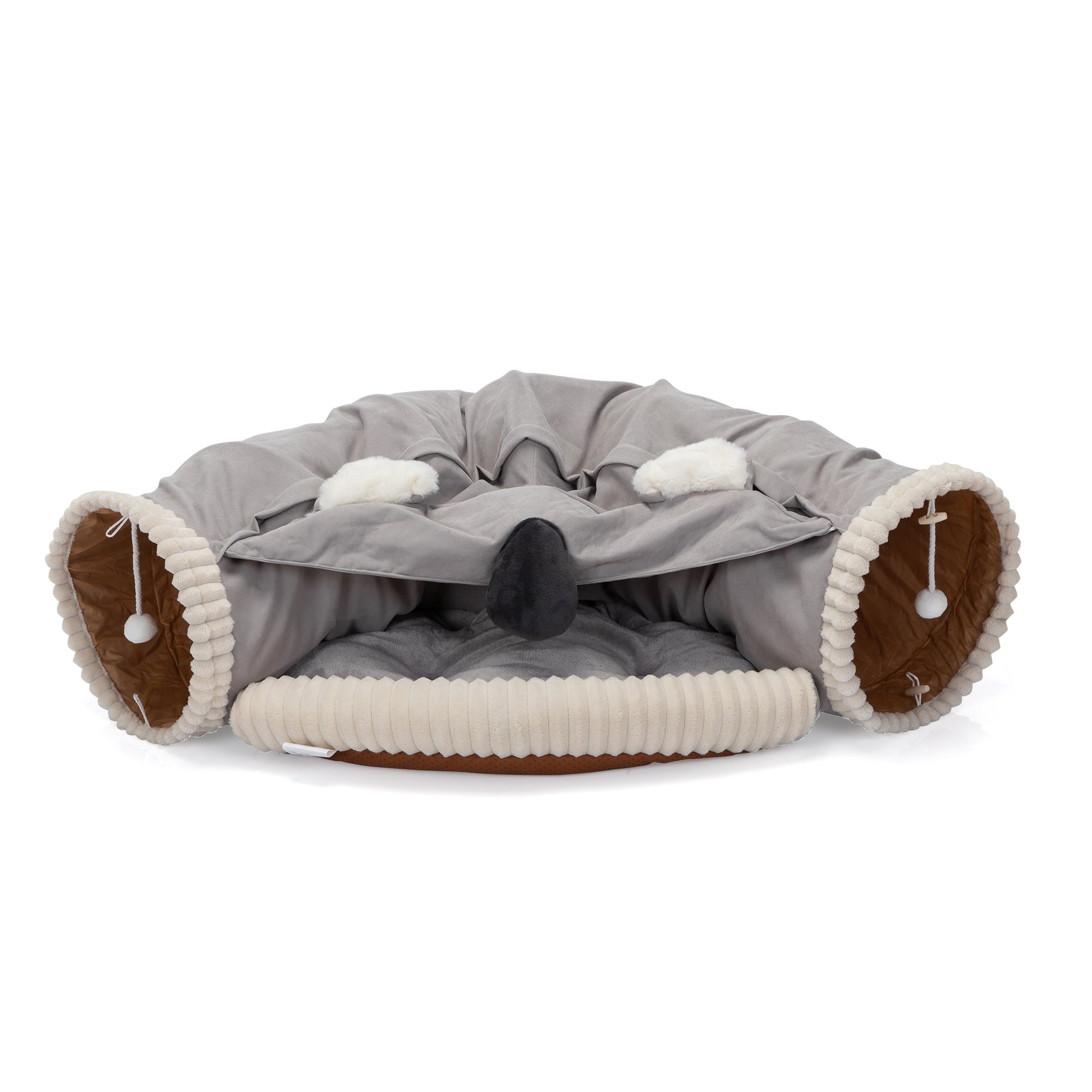 [Versatile Tunnel]: This cat toy combines a tunnel and comfy mat that can be used as a cave; hideaway; tent and bed. Hanging mice and built-in sound paper also add more fun to your cat.