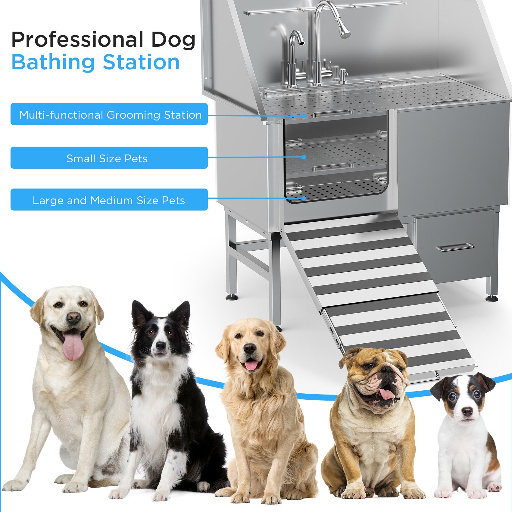 INNOVATIVE FEATURES - Designed for strength and durability, The High-Quality Dog Tub for Grooming is equipped with Ramp-Door / Functional Faucet with Pull Out Dog Shower Head / Soap Dispenser / Hair trap / Drain Kit / Two-piece, Removable Floor Grate / Bathtub Backsplash and Storage Drawer.